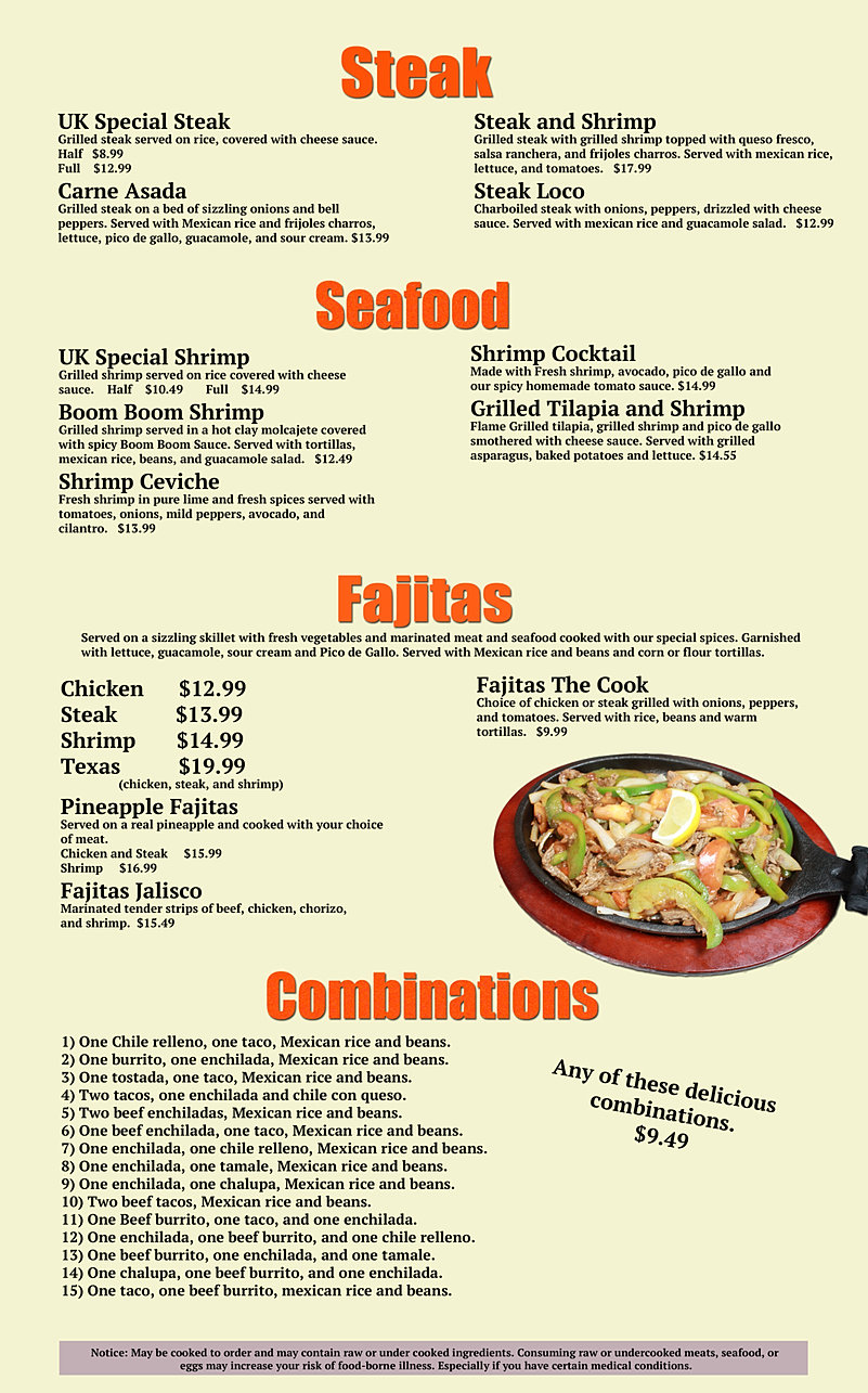 Beef, chicken, shrimp chorizoand park tips. Menu items and prices are subject to change without prior notice. See restaurant menus, reviews, hours, photos, maps and directions. From the decor of our four restaurants to the preparation of every dish, we use the traditions our parents set out for us as children.